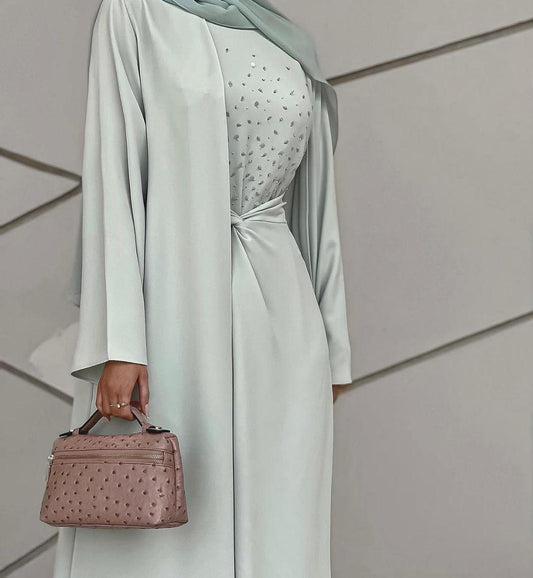 طقم إسلامي مكون من ثلاث قطع مزين بالخرز بلون سادة