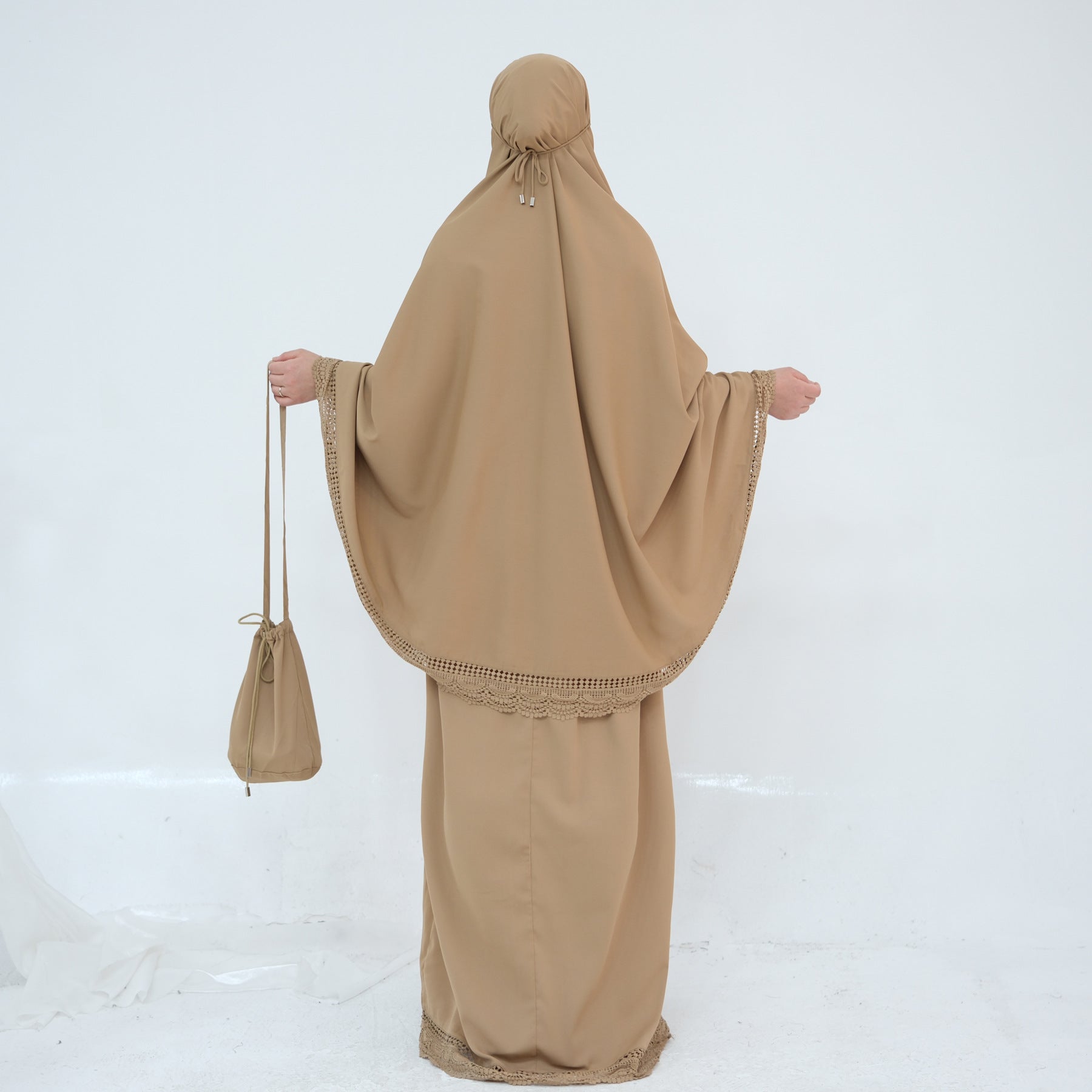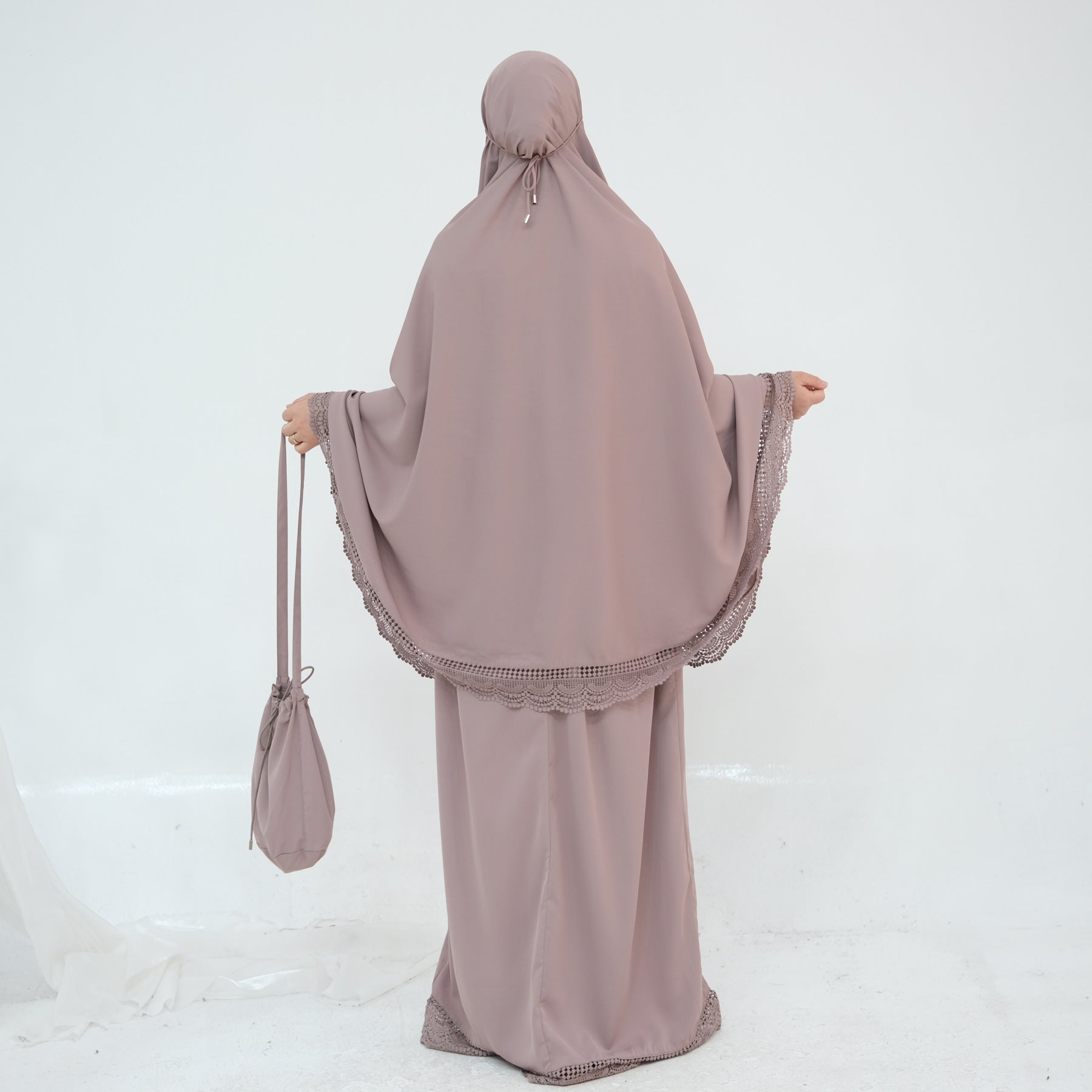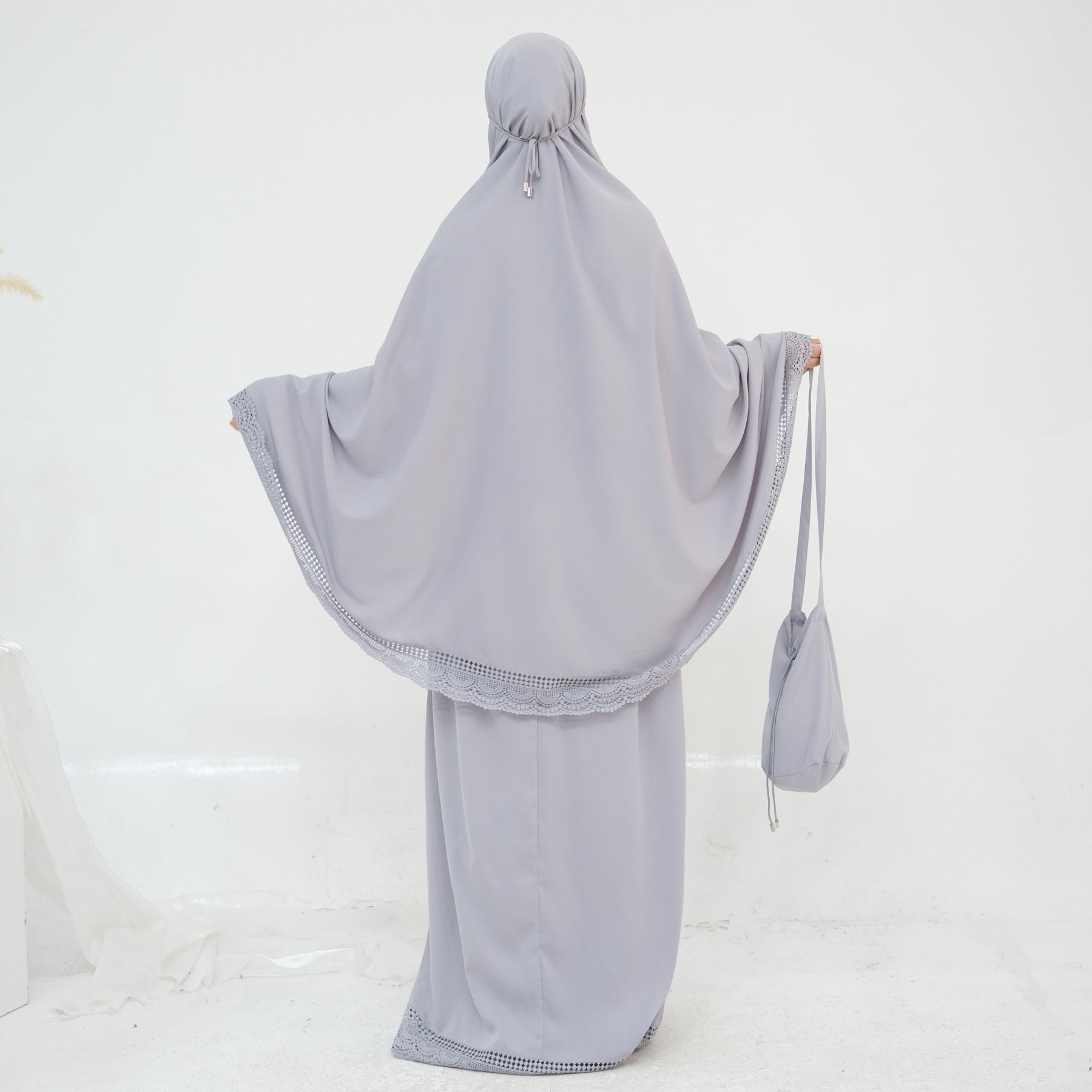 The set consists of four pieces: a lace headscarf, a matching robe, a prayer mat, and a convenient storage bag.