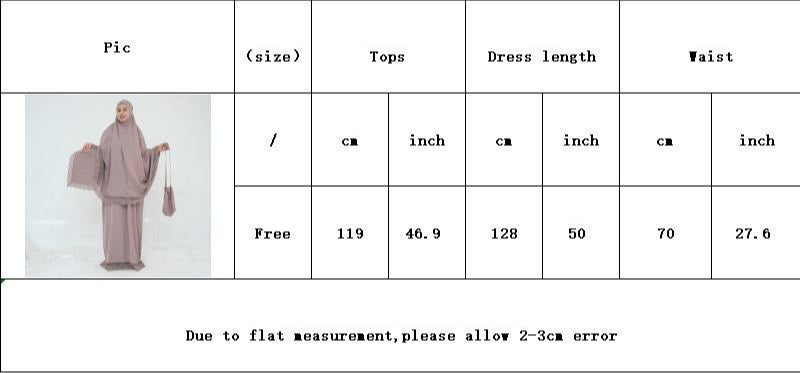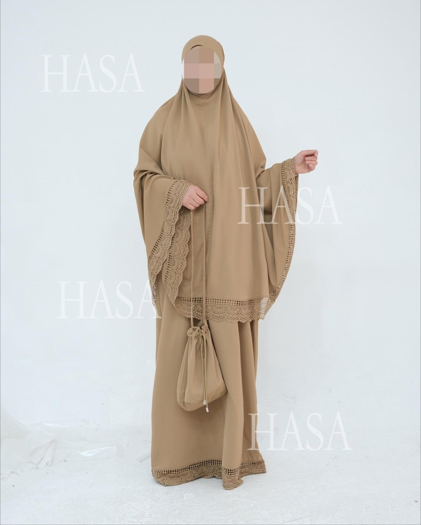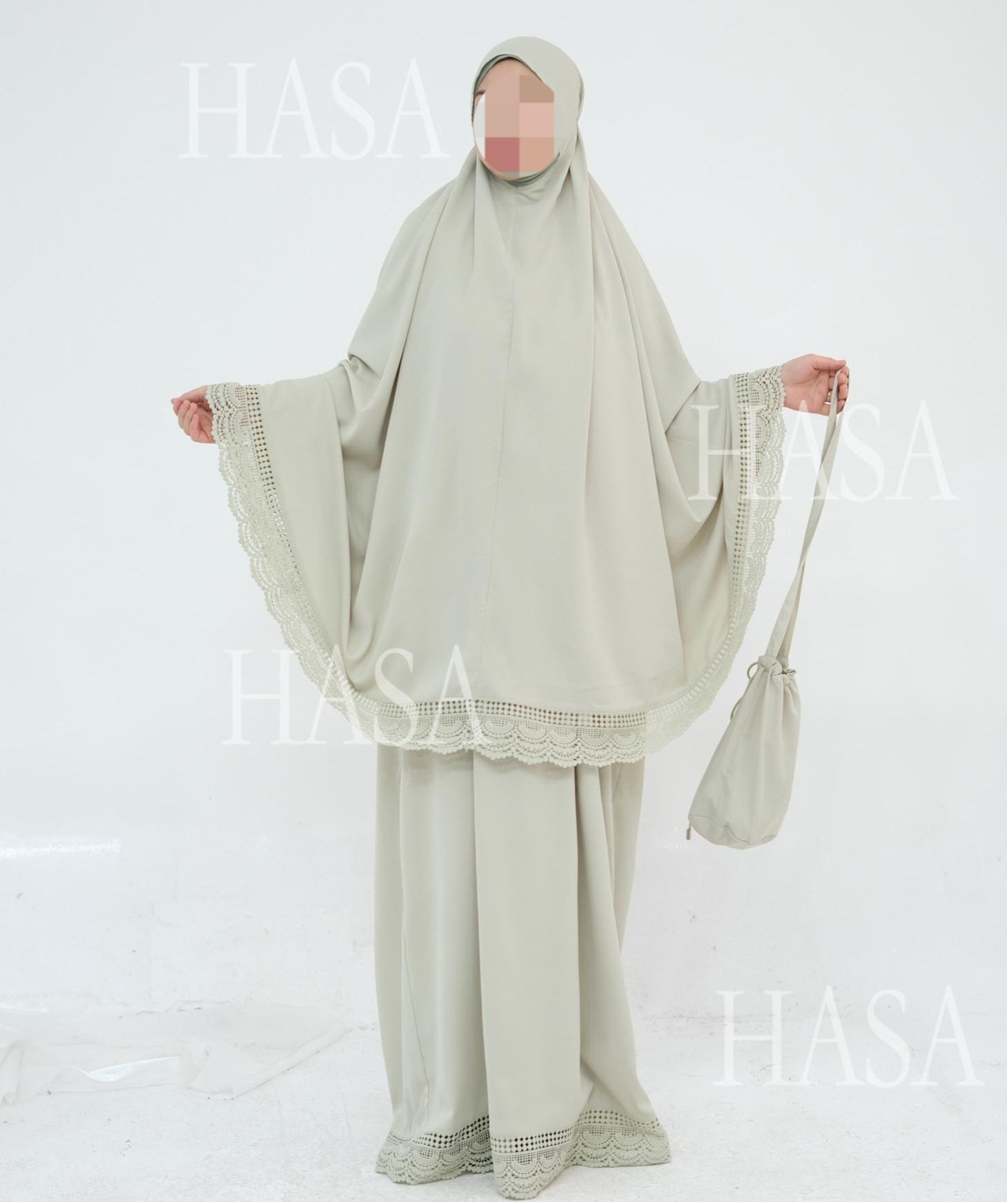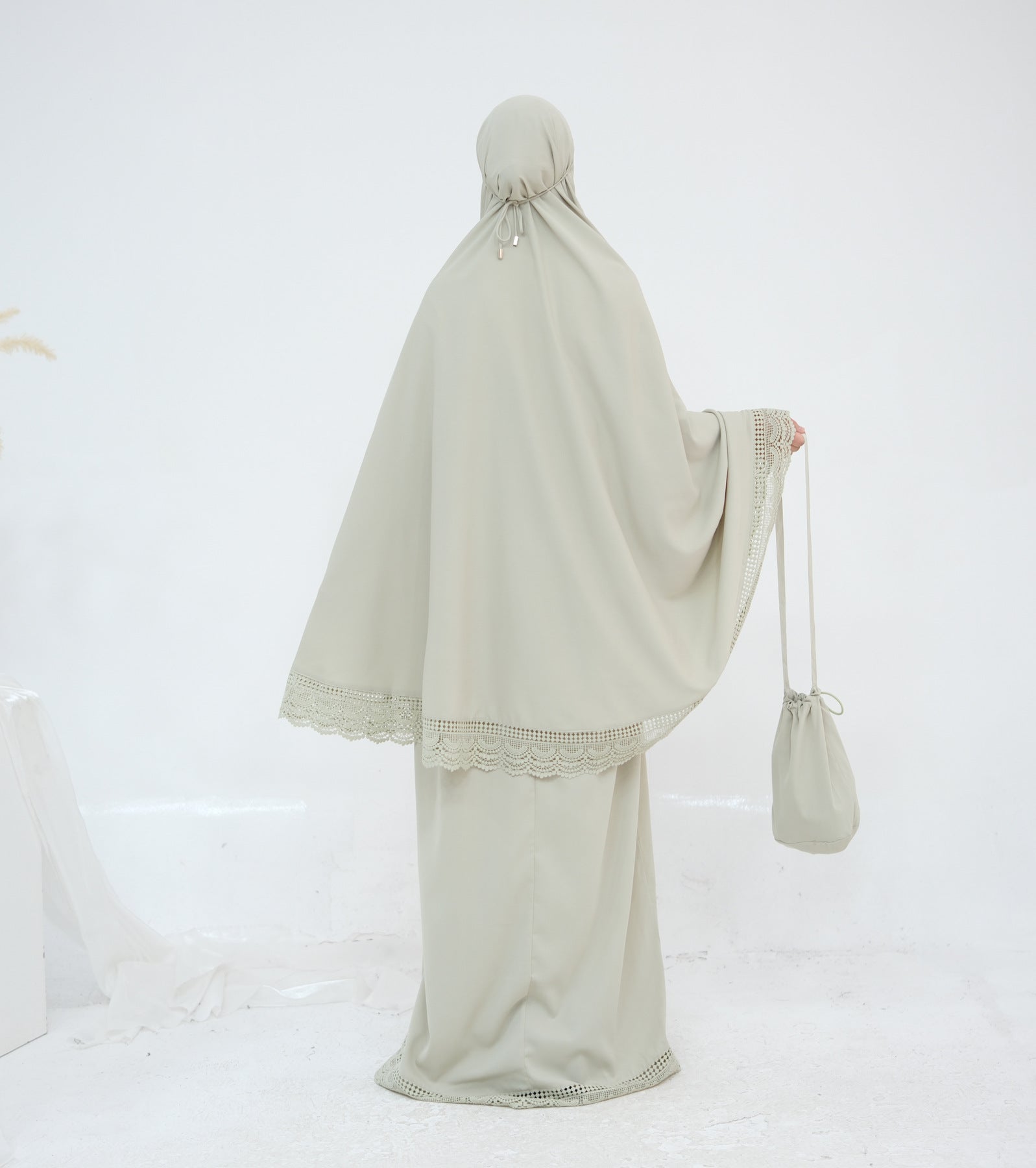 The set consists of four pieces: a lace headscarf, a matching robe, a prayer mat, and a convenient storage bag.