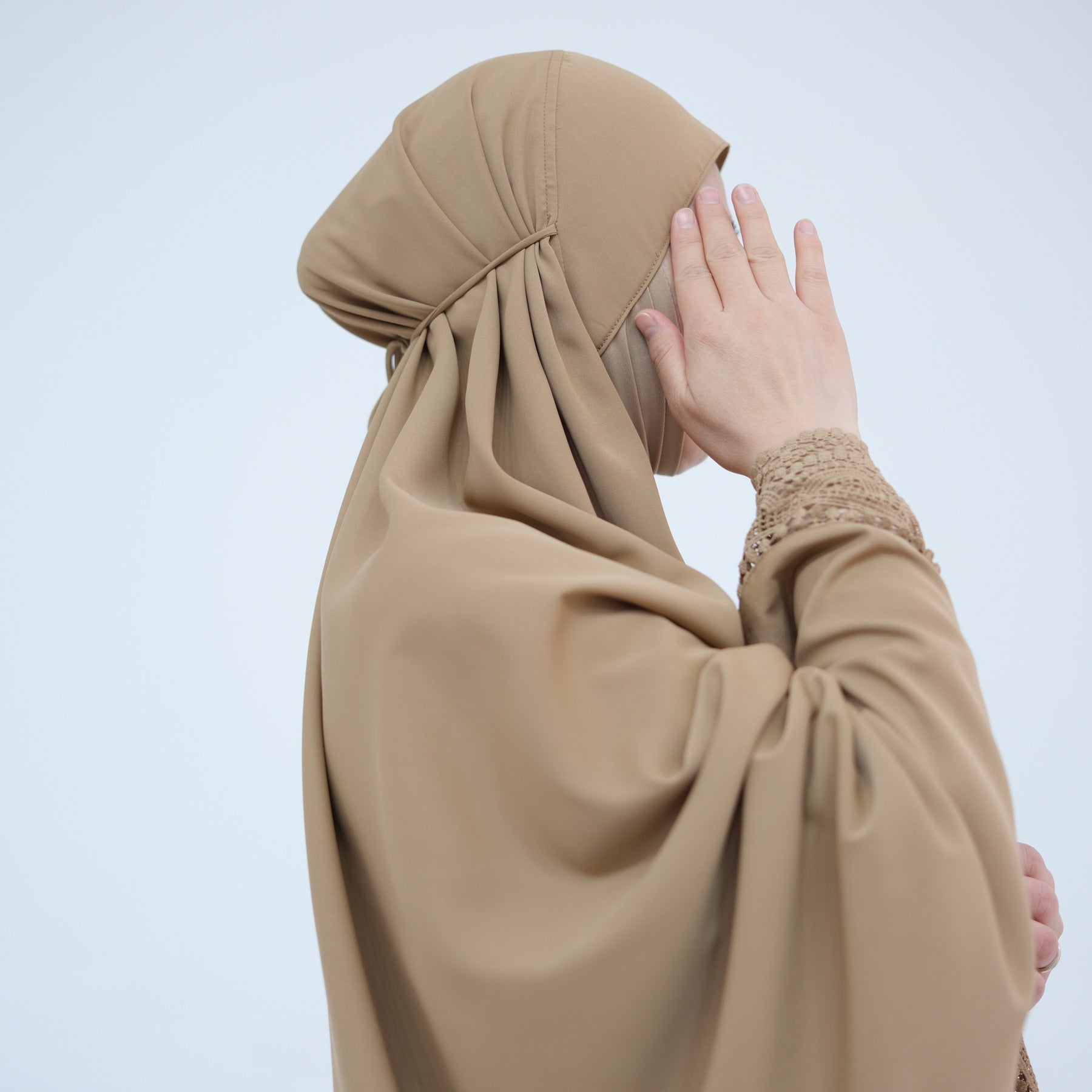 The robe has a loose, straight cut and is paired with a matching headscarf for a unified and harmonious style.