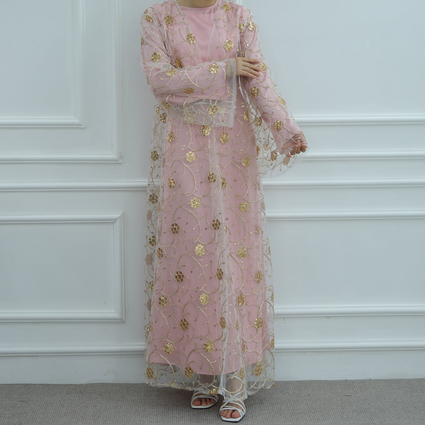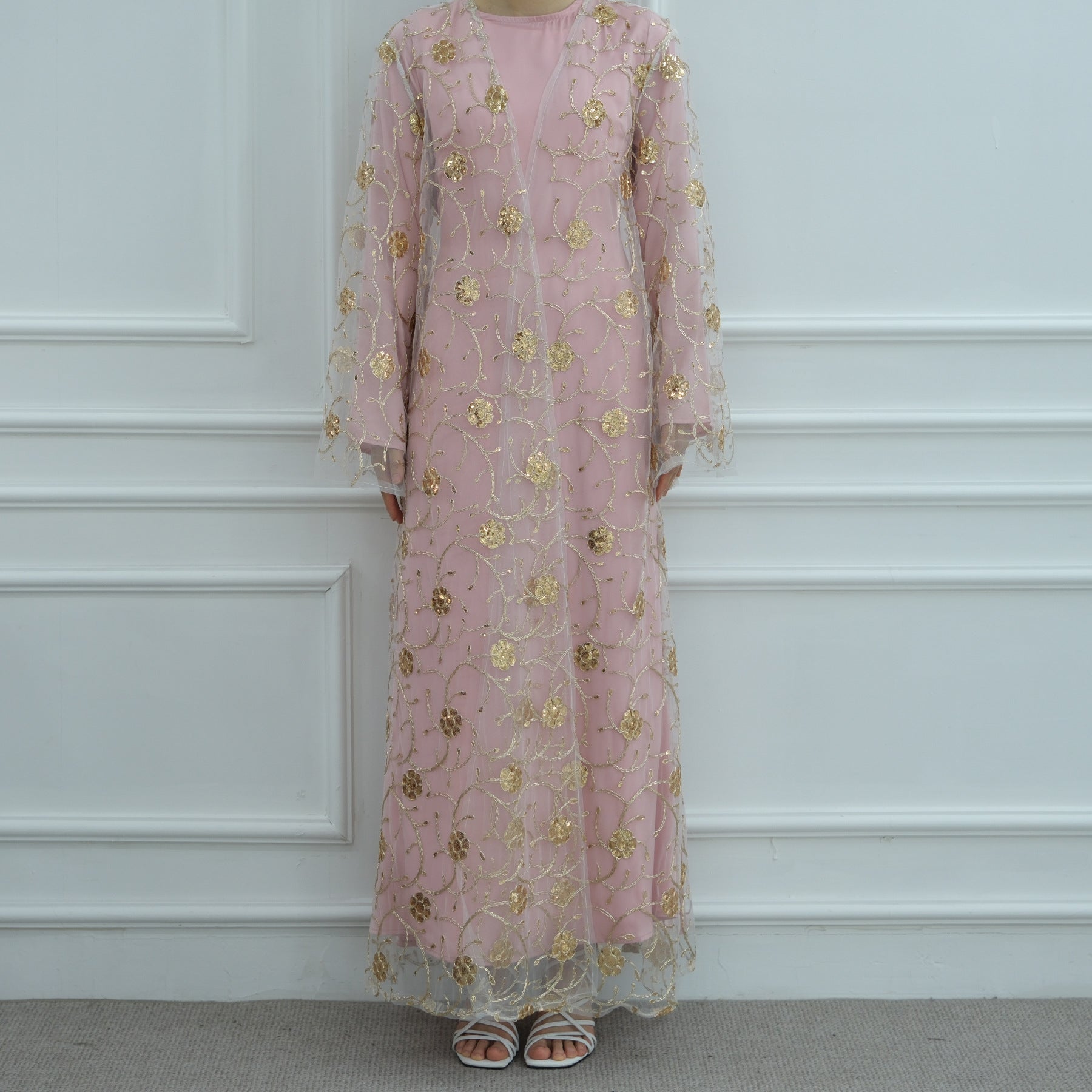 Floral Embroidery: Floral embroidery outlined in gold thread, with fine stitches and a clear pattern, adds a touch of sophistication to the overall look.