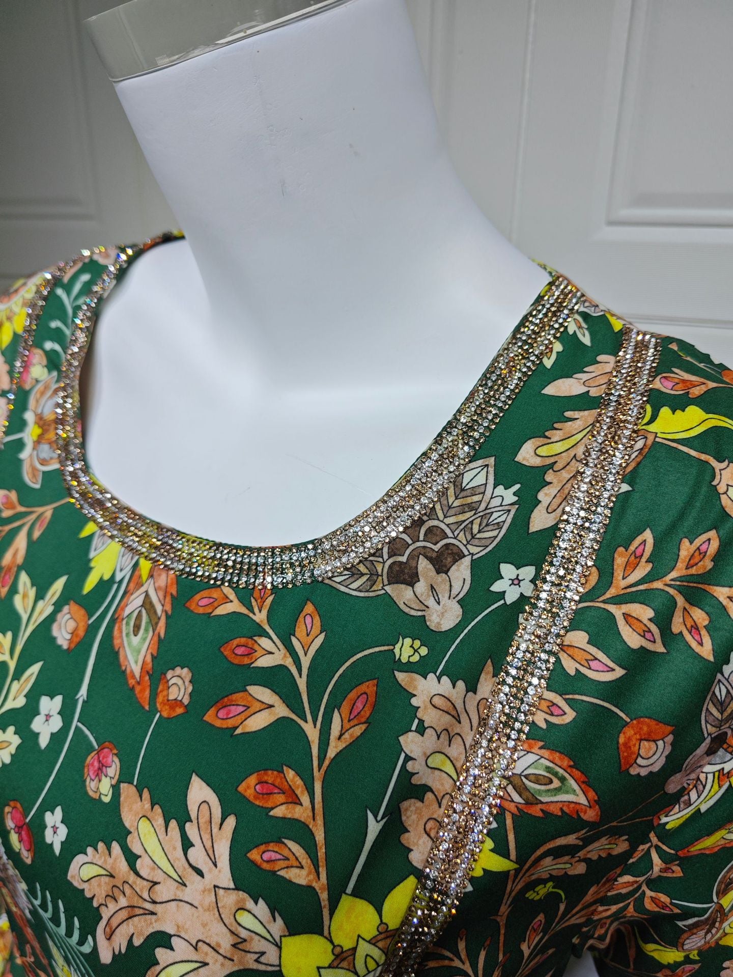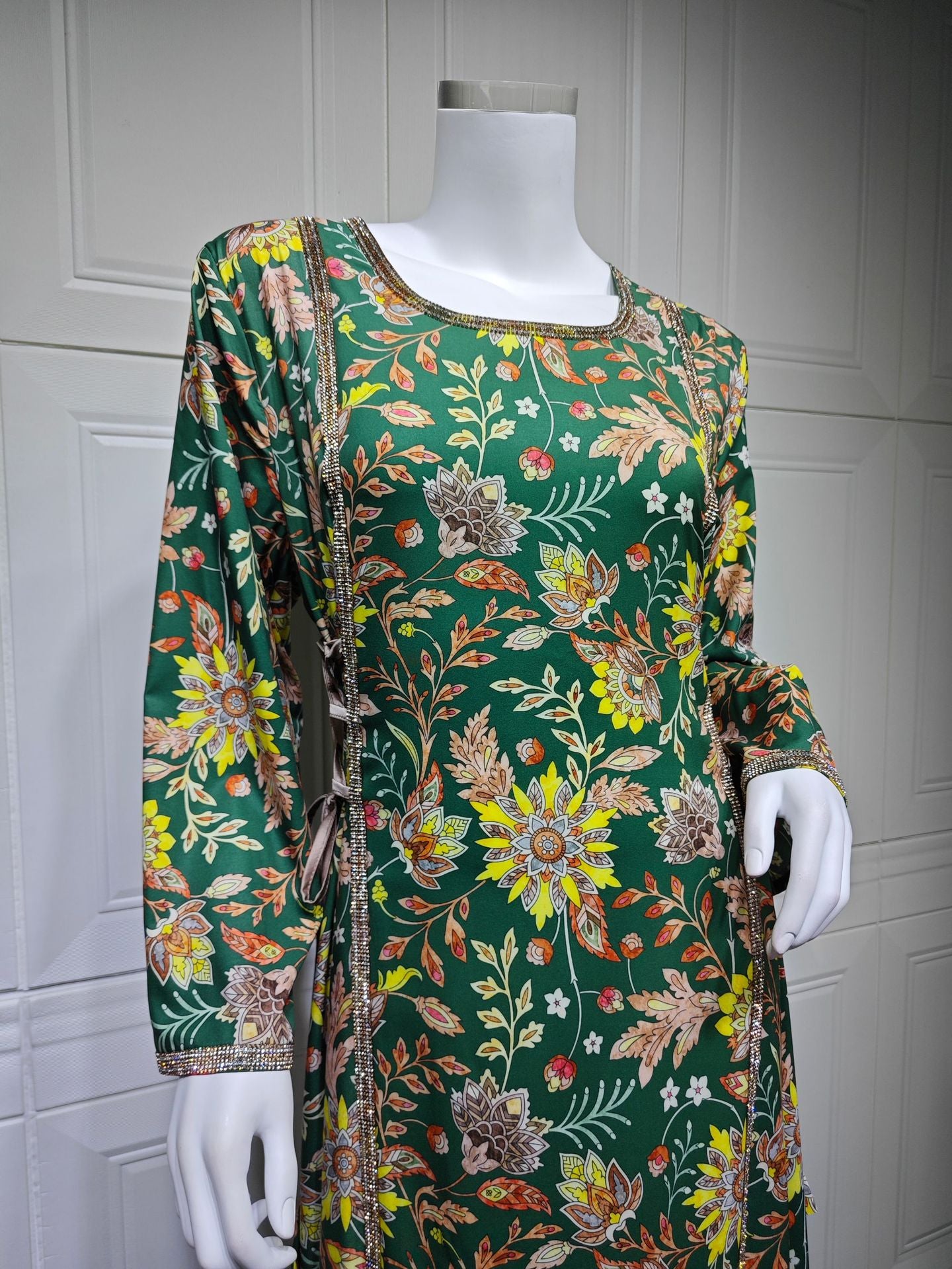 Fine sequins are scattered throughout the print, adding a subtle sheen and creating delicate shimmer under light.