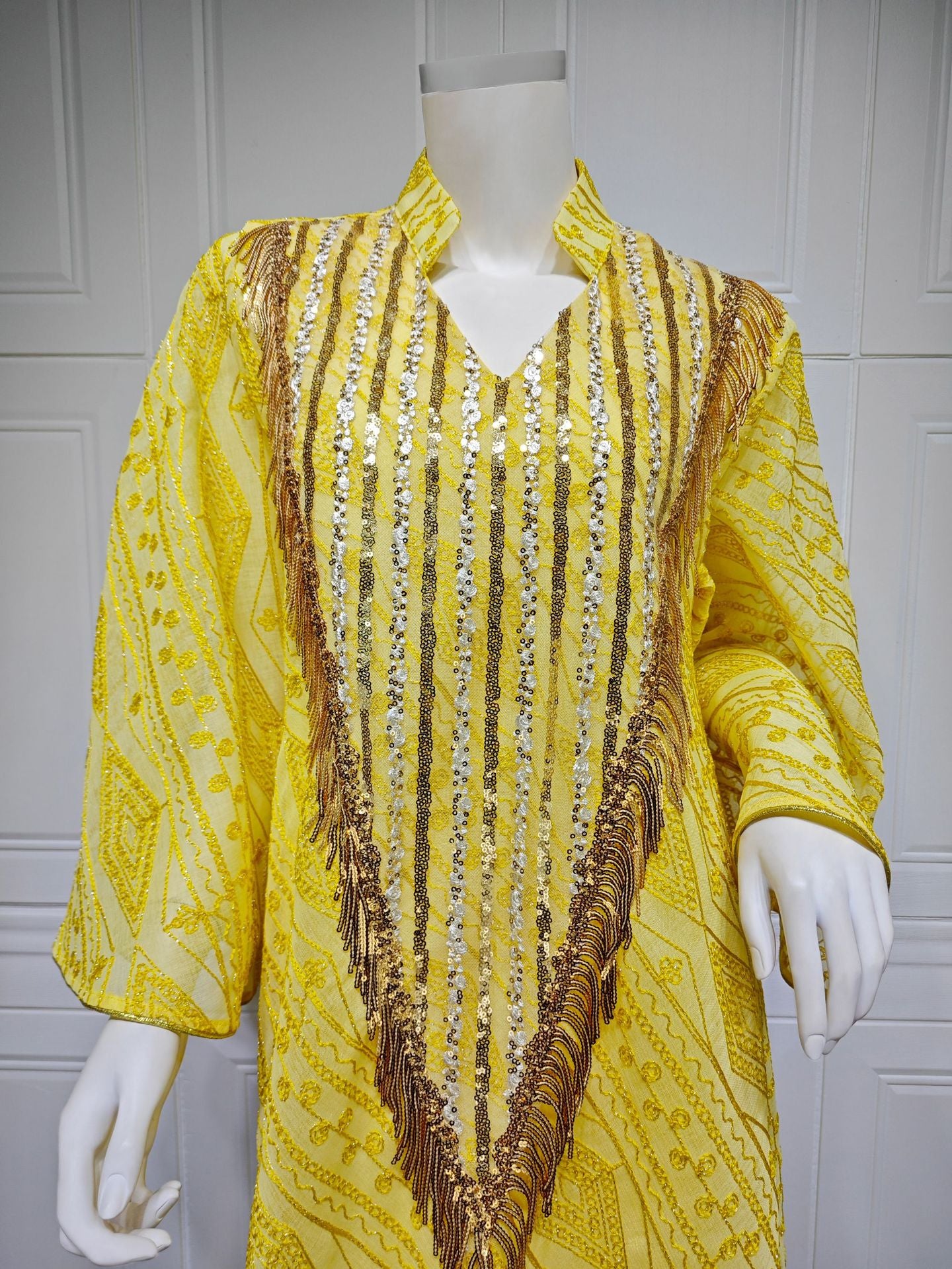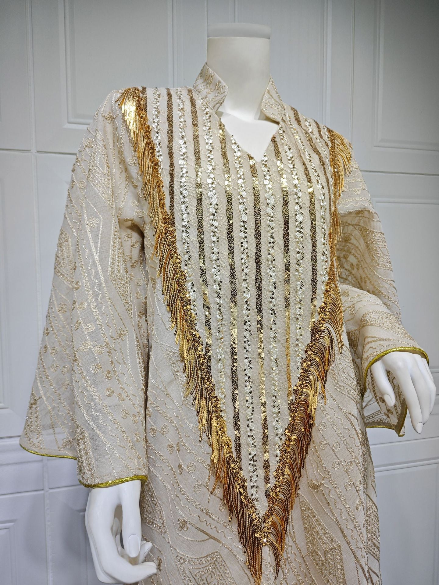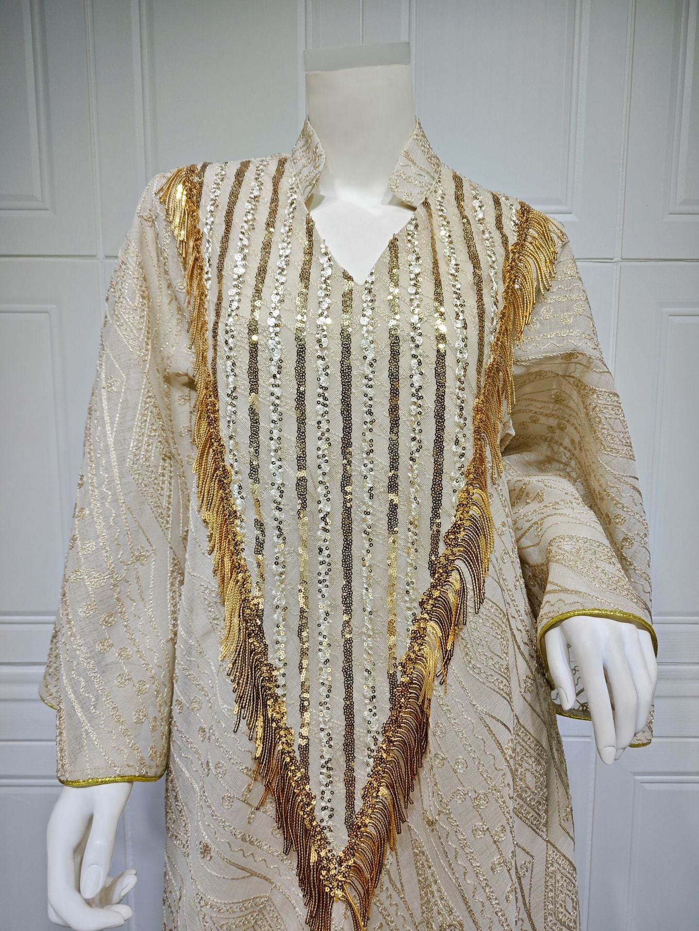 HS6648 A long robe with mesh sequins and embroidered details; an elegant and sophisticated dress.