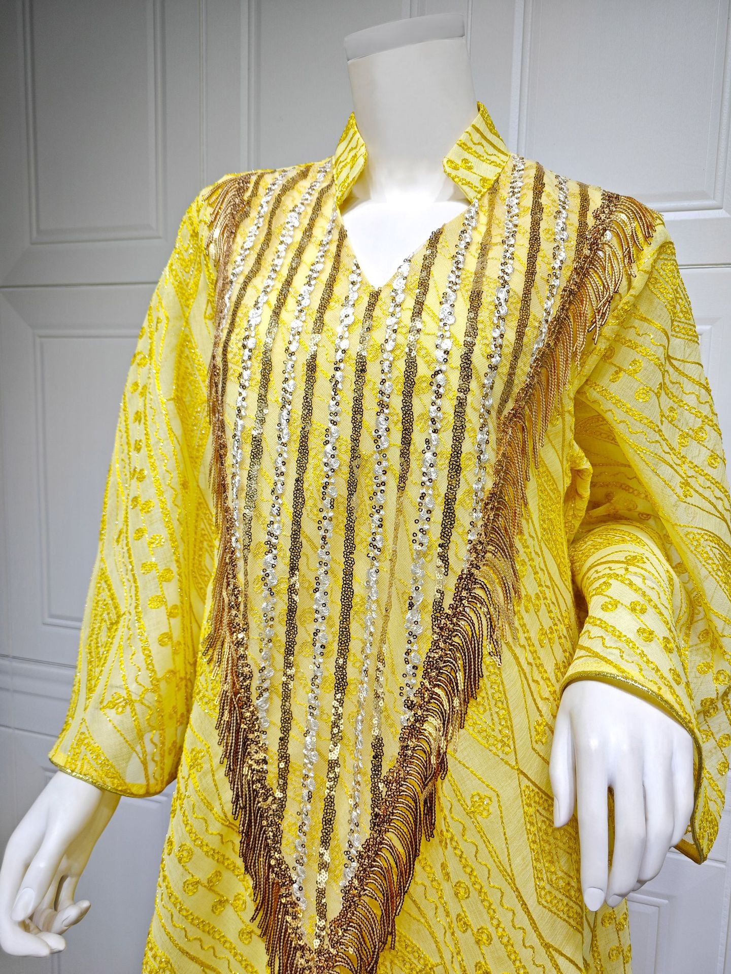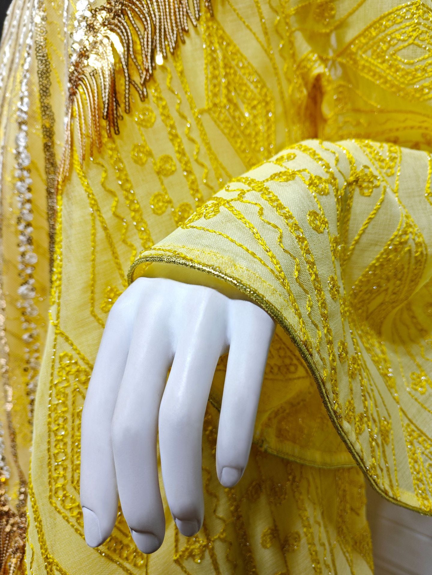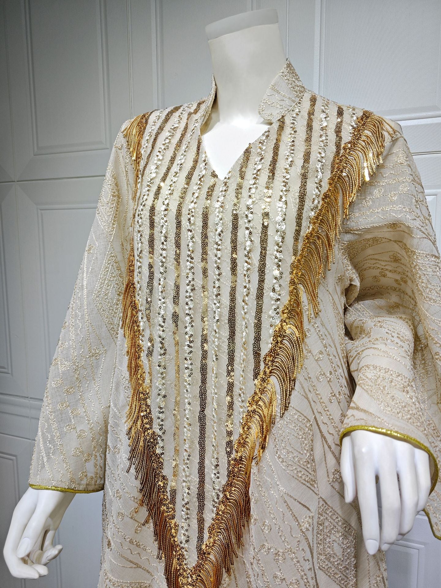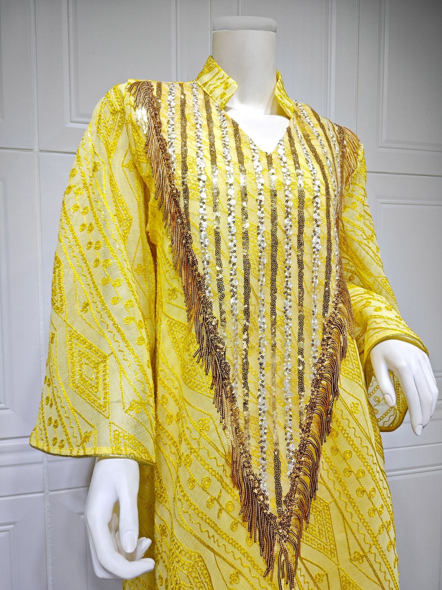 HS6648 A long robe with mesh sequins and embroidered details; an elegant and sophisticated dress.
