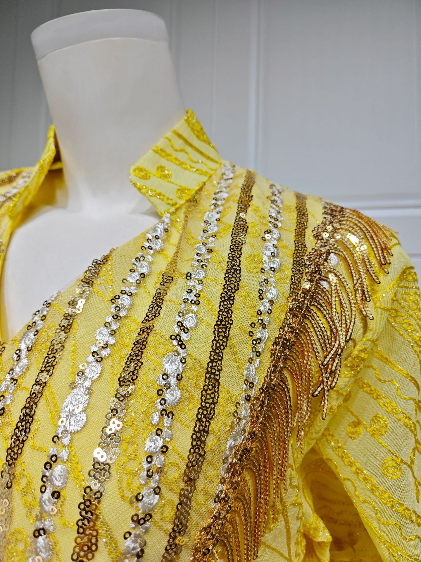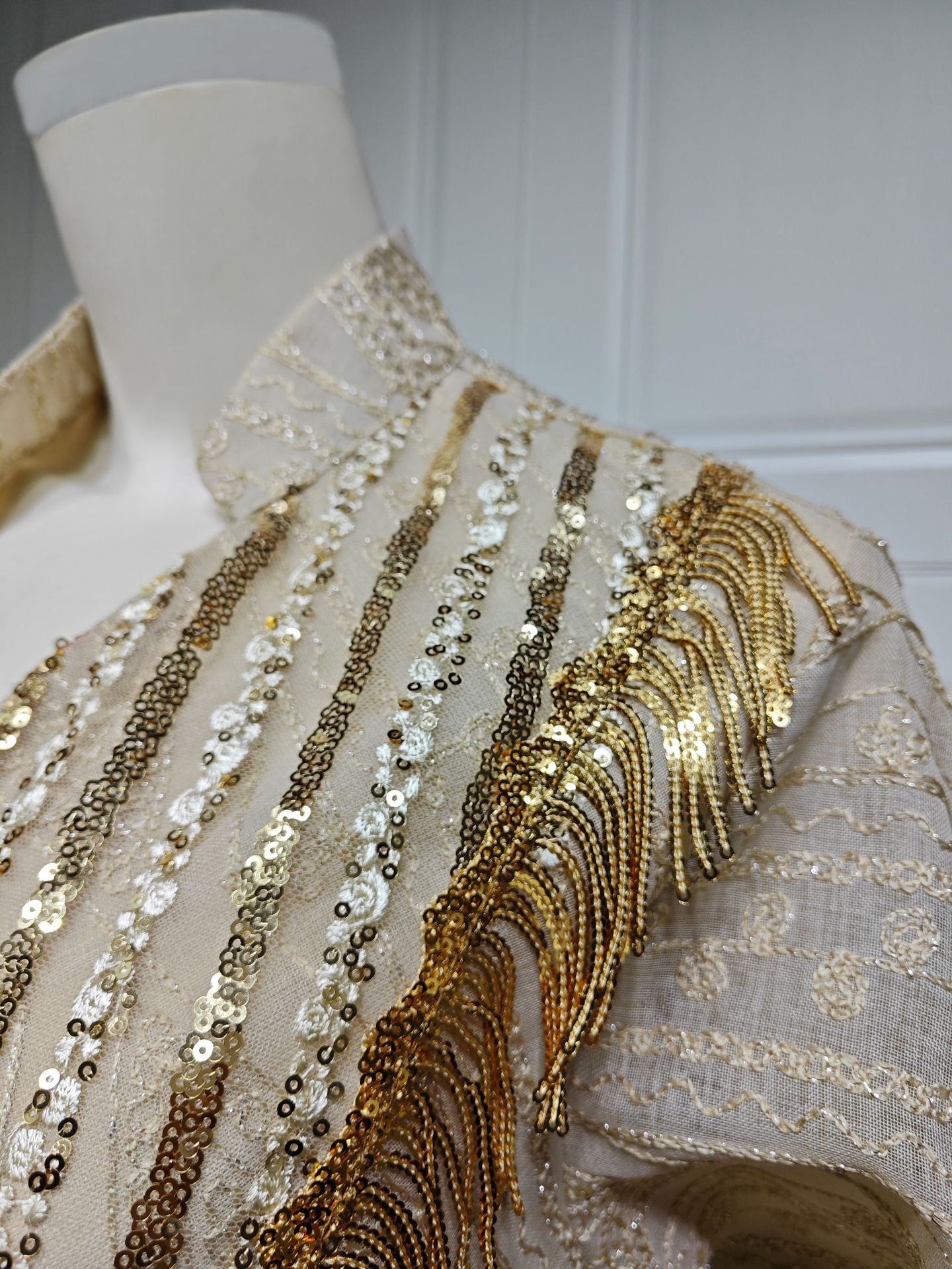 The combination of sequins and embroidery in the mesh sections adds three-dimensionality to the patterns, creating a soft and refined decorative effect.