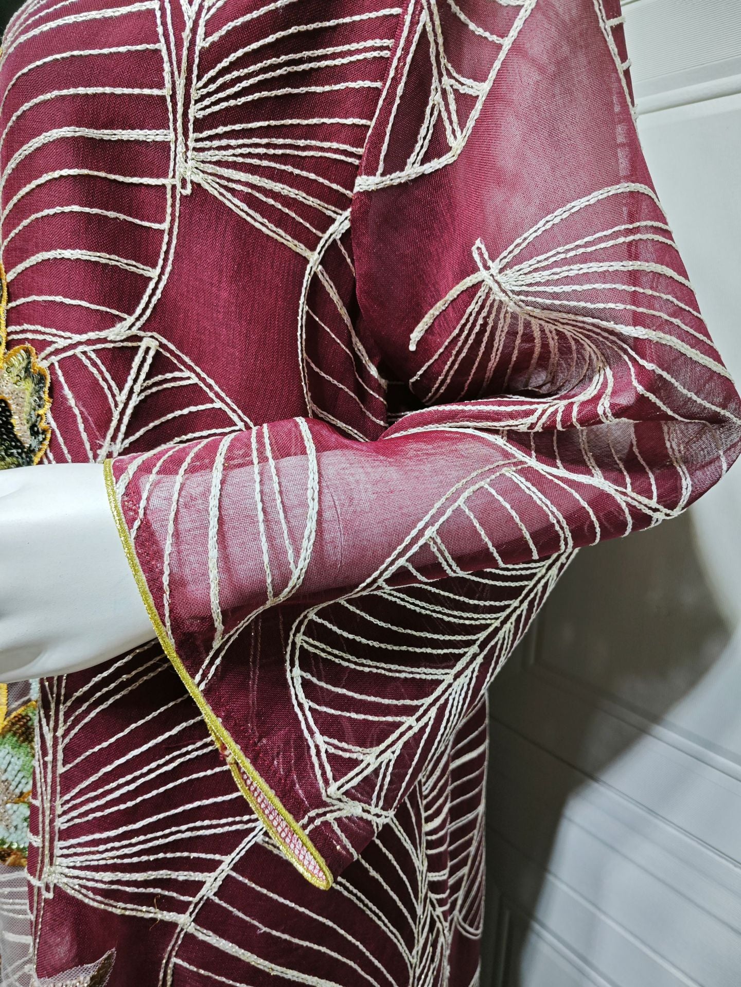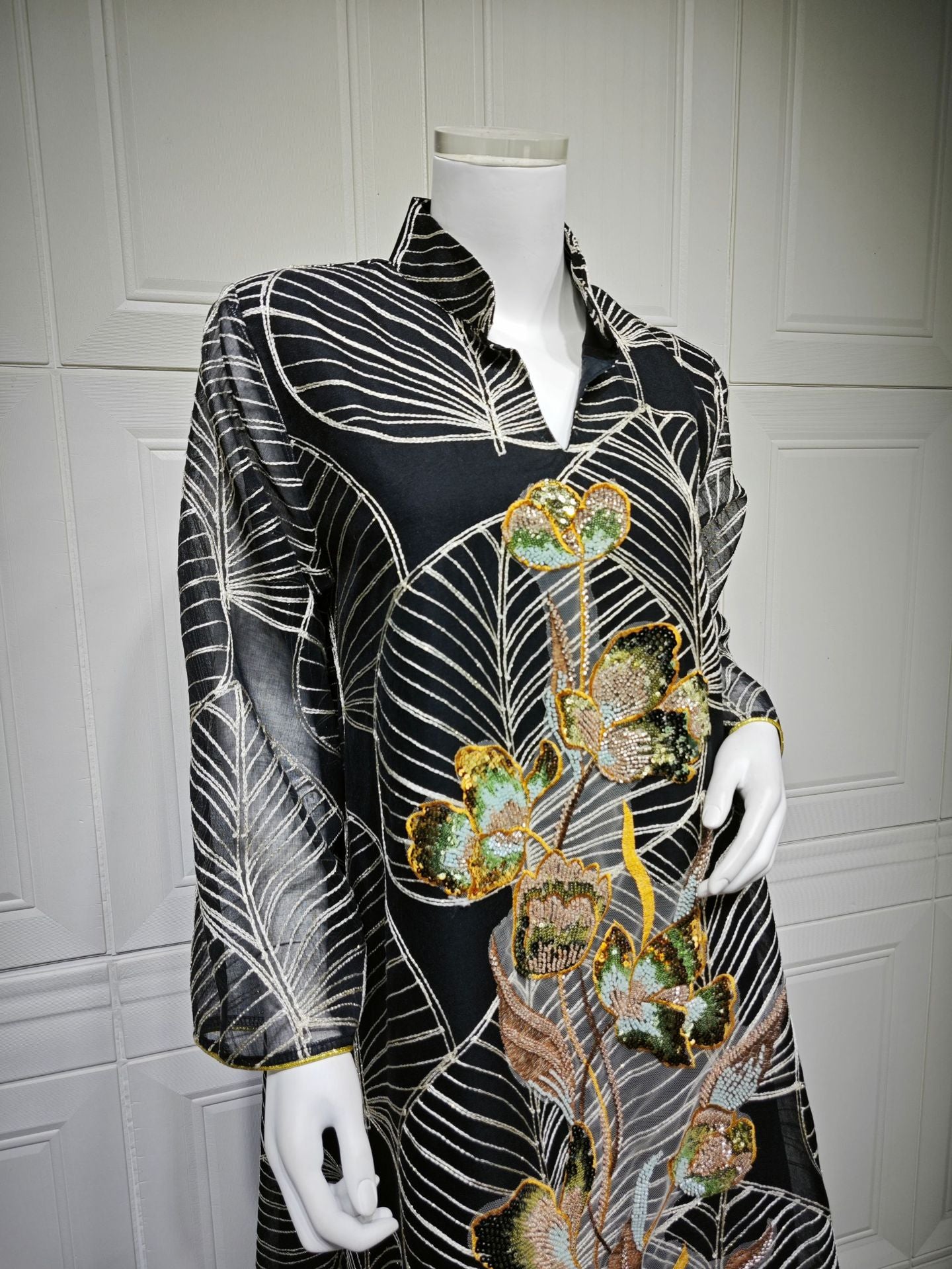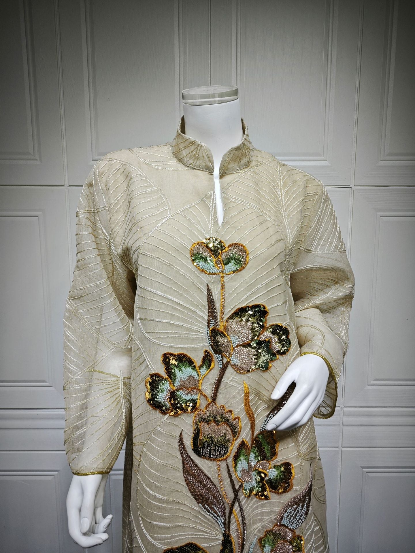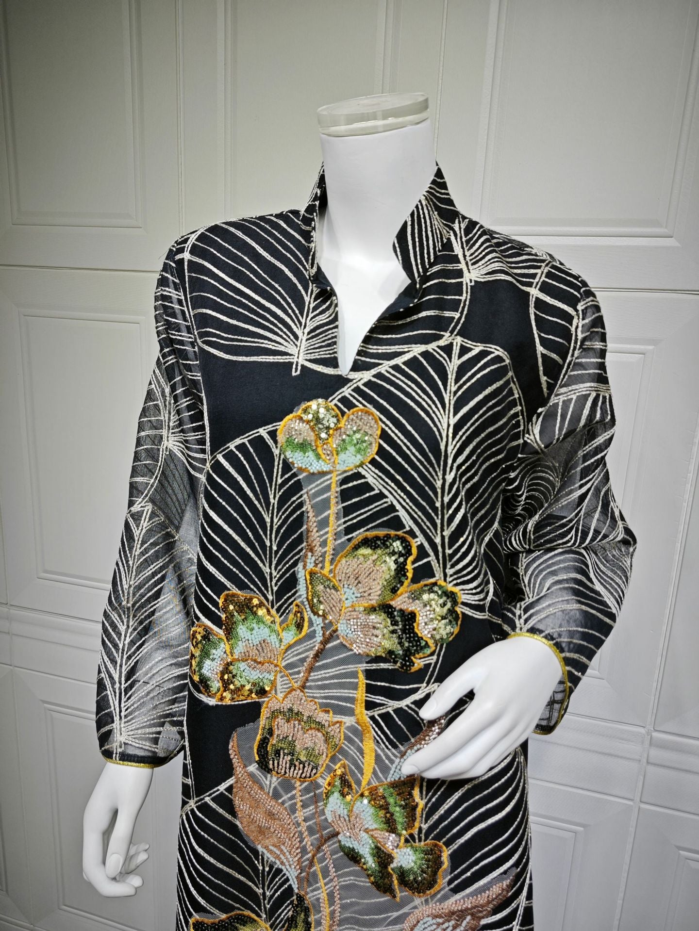 Embroidered patterns are applied to the mesh, with delicate stitching enhancing the overall texture.