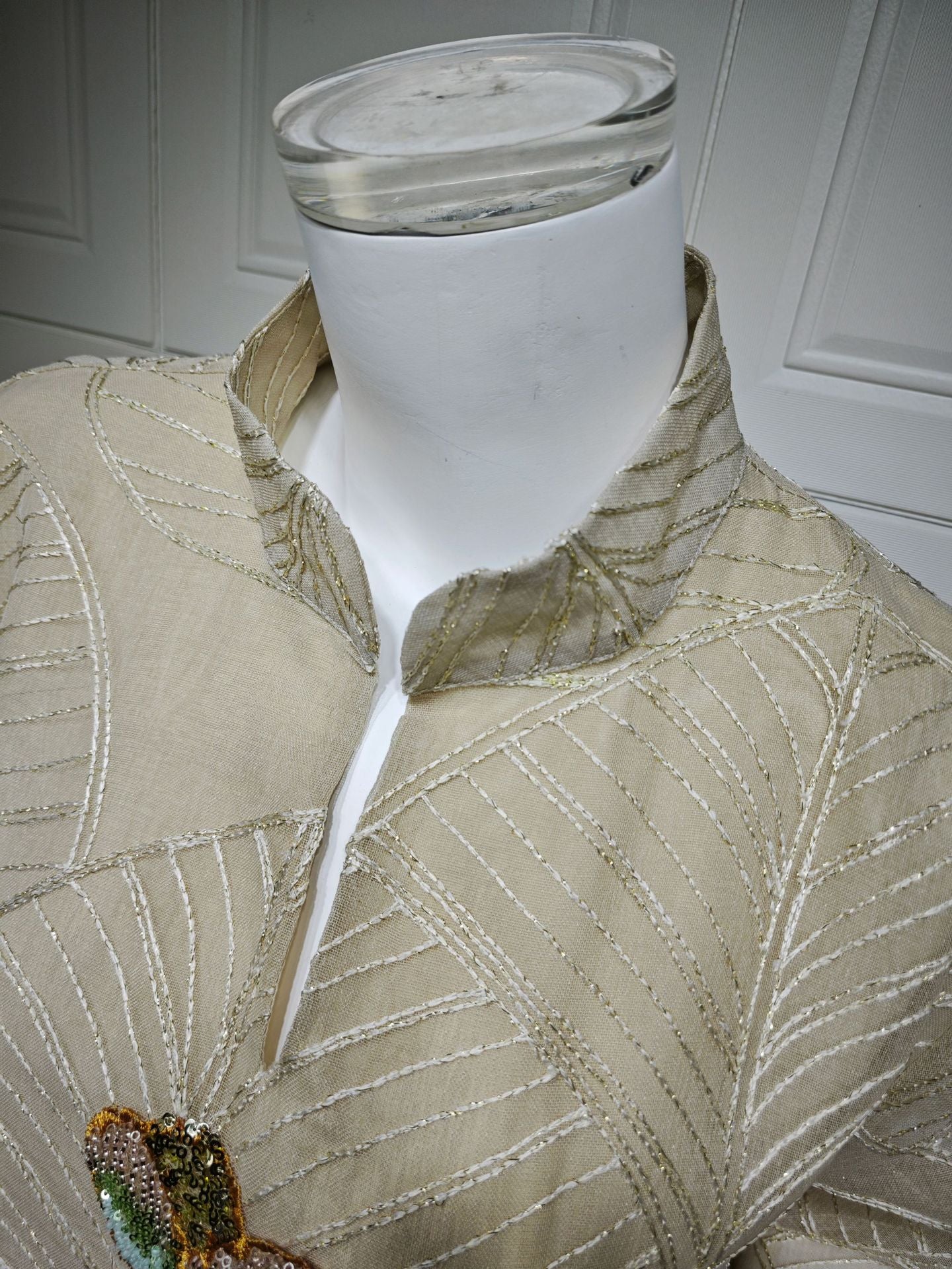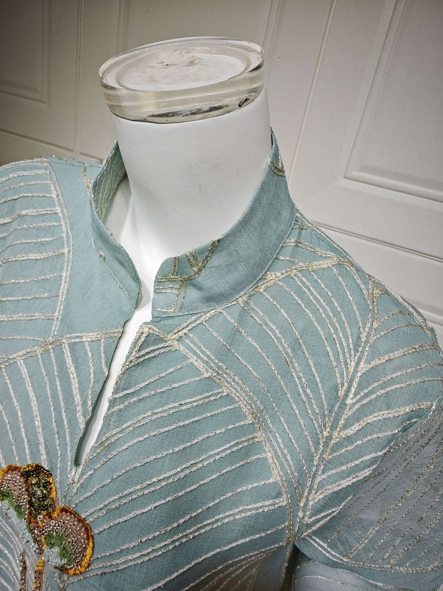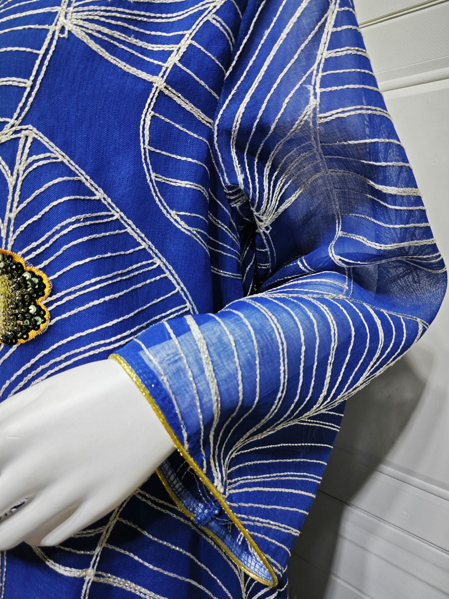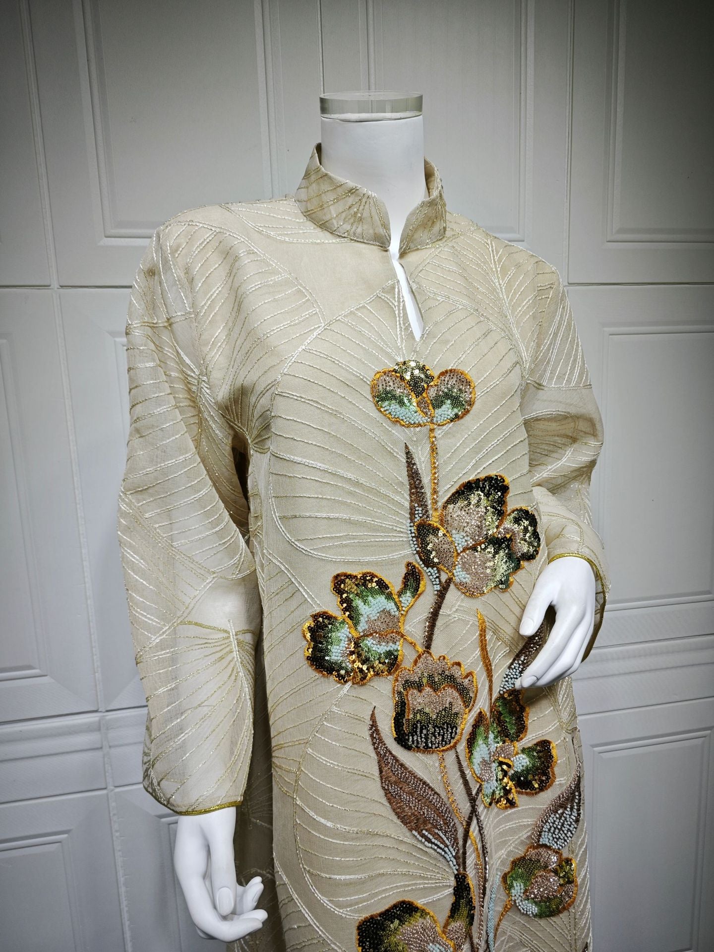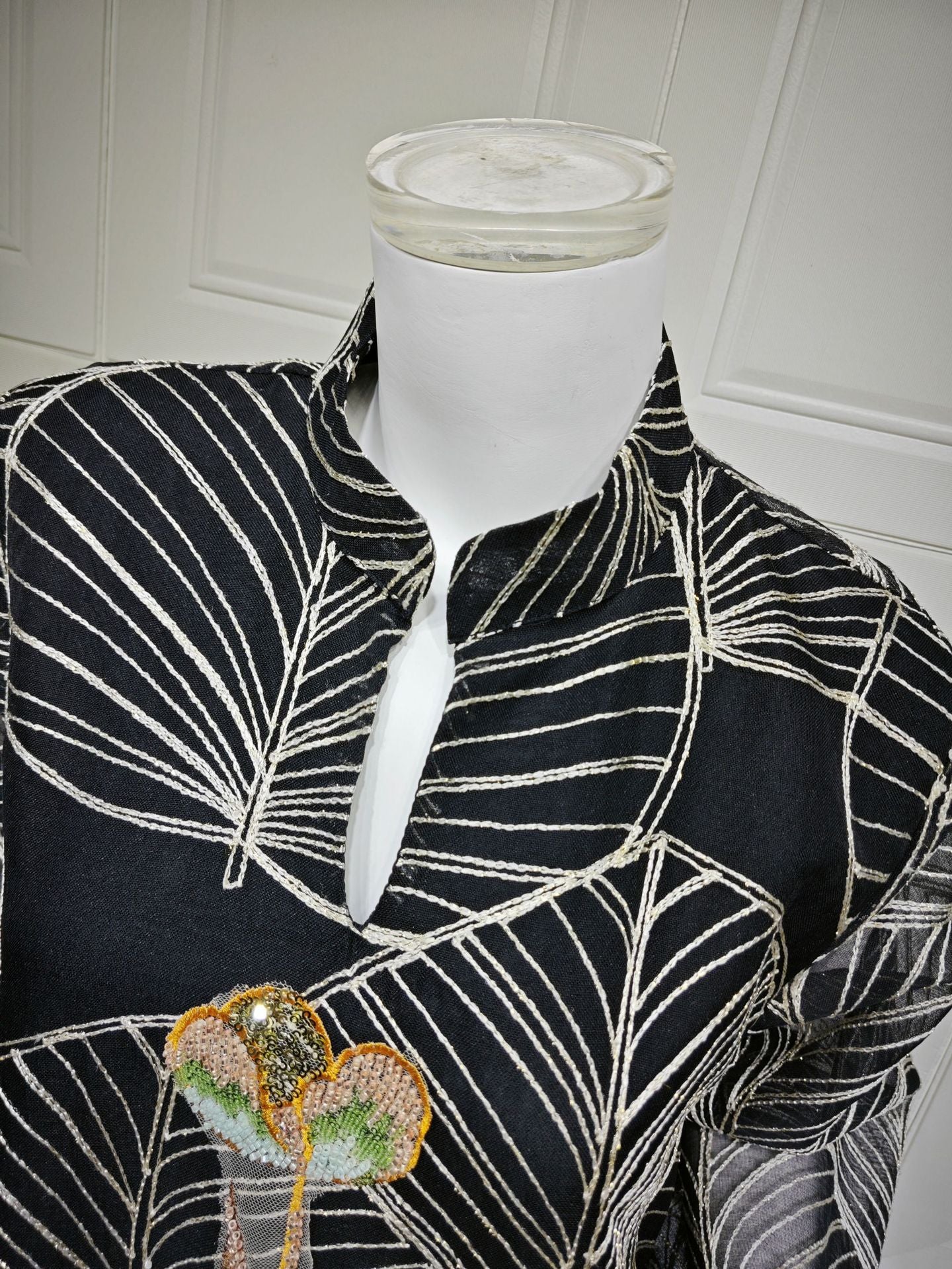 Embroidered patterns are applied to the mesh, with delicate stitching enhancing the overall texture.