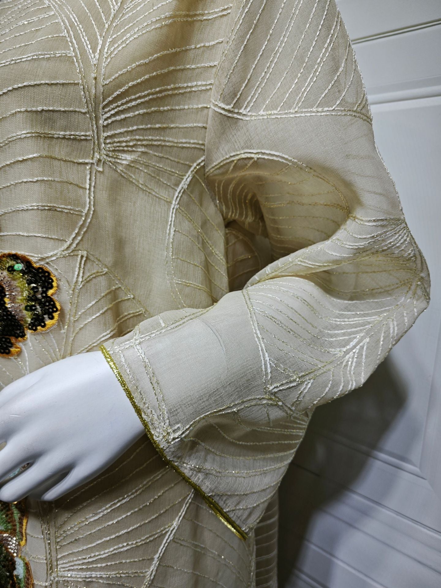 The sleeves blend seamlessly with the skirt, maintaining the overall continuity of the garment.