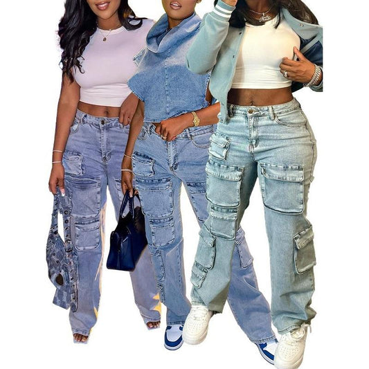 HS1917 Three-dimensional Multi-bag Tooling Style Denim Trousers