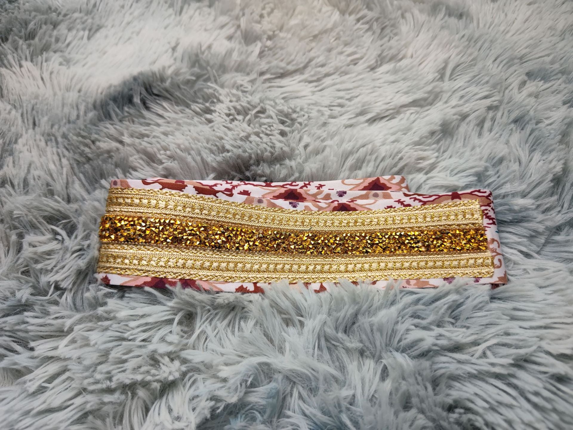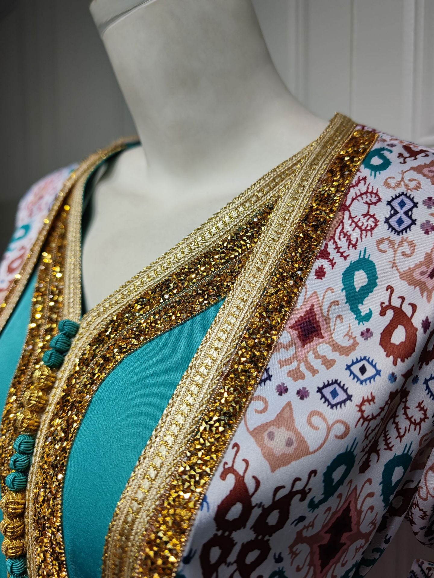 The outer layer is a cardigan-style robe decorated with rows or areas of rhinestone embroidery, with a simple yet layered pattern.